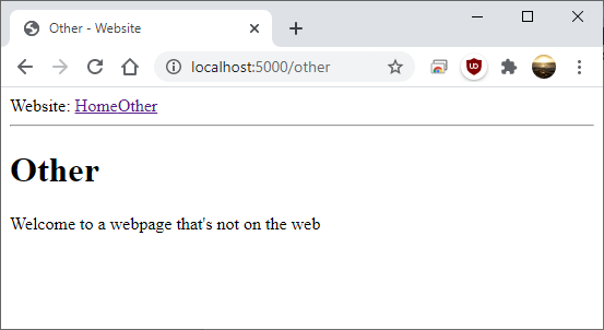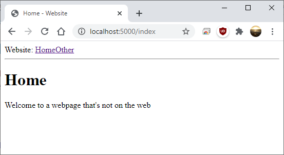 Now if we run flask we’ll see that the code from index.html is inserted into the block area in base.html.