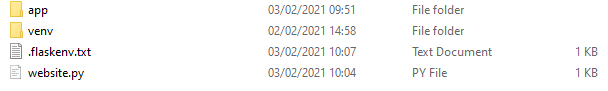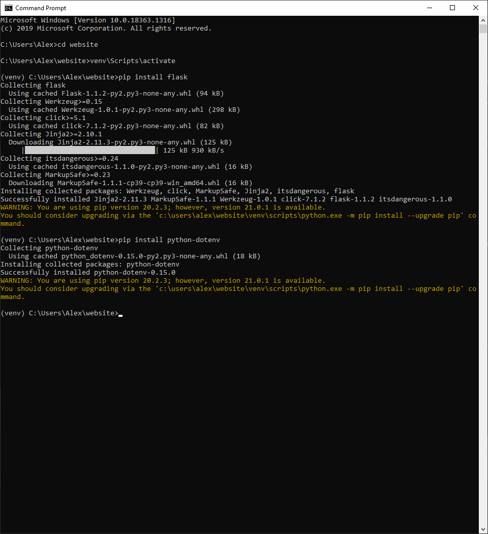 Lets create another folder, this time inside the website folder. If you’re inside the website folder, your commands will all be prefixed by this (venv) C:\Users\Alex\website>