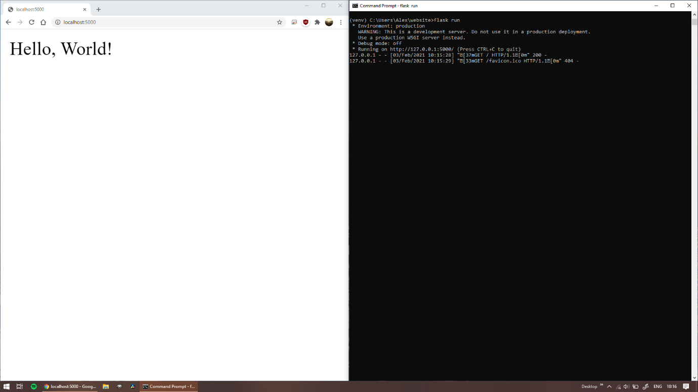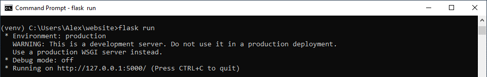 Let’s run it now. Enter “flask run” into command prompt. You’ll get a few warning about how it shouldn’t be used as a proper server, but you’re now all set with your own server running.